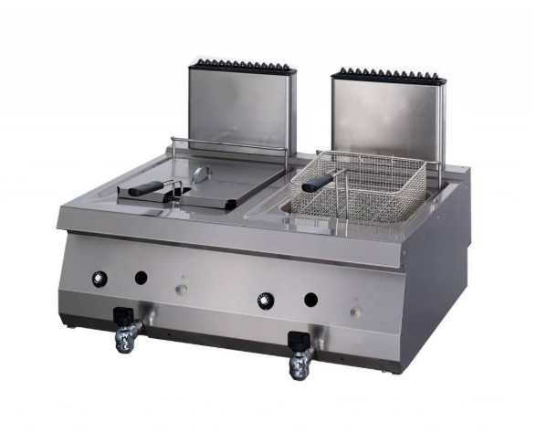 Nagy teherbírású, kétmedencés (2 x 12 literes), pultra helyezhető, gázüzemű olajsütő, amelyet forgalmas, professzionális konyhákba terveztek nagy mennyiségű étel gyors és hatékony elkészítéséhez. Robusztus, teljes egészében rozsdamentes acélból készült, monoblokk kialakítással és zökkenőmentesen hegesztett tetővel rendelkezik, ami garantálja a tartósságot és a könnyű tisztíthatóságot.
