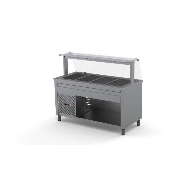 - Digitális vezérlés (4-8 °C), három oldalon burkolt, a kiszolgáló tér felől nyitott, alsó polc