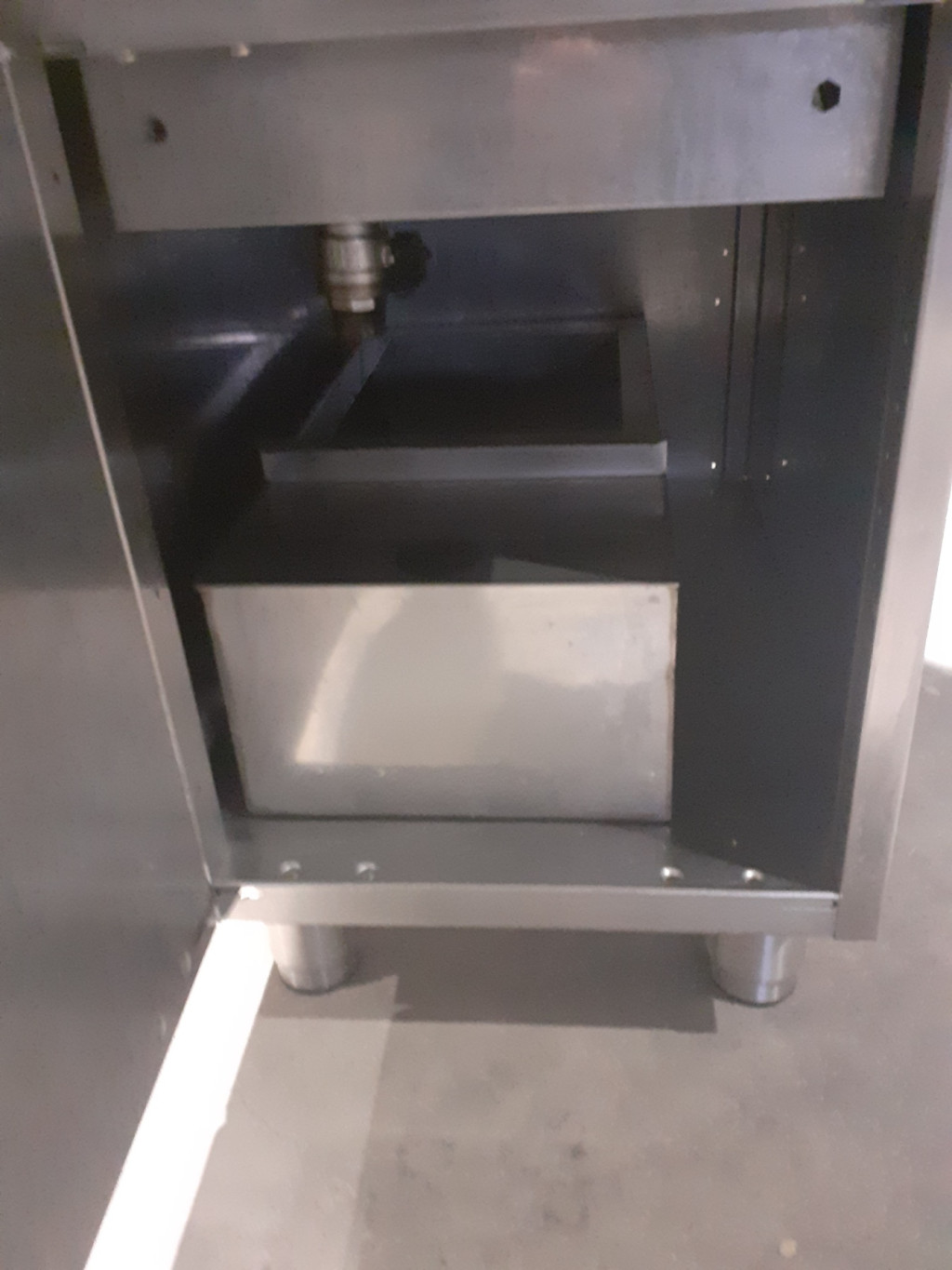 háromfázisú, elektromos ipari olajsütő, fritőz berendezés, rozsdamentes acélból, tárolóval, 13 literes medencével, IPX5 védelemmel.