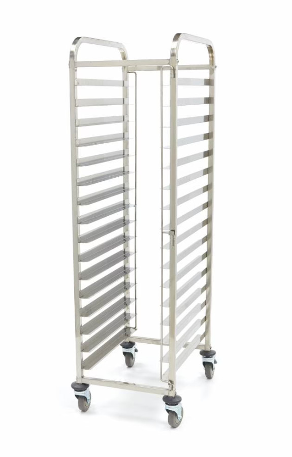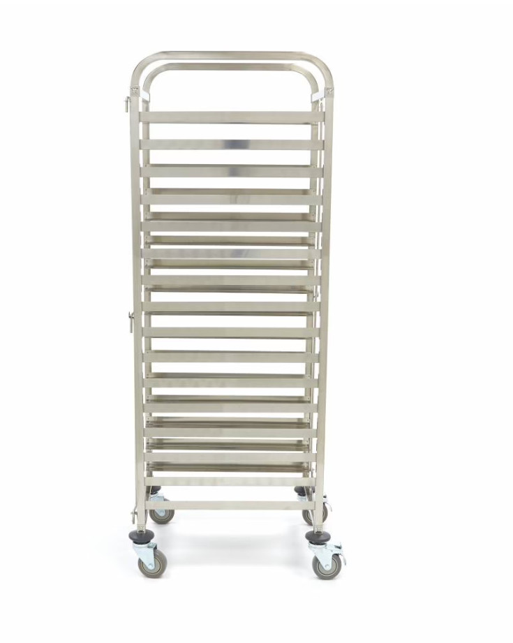 Ez a rozsdamentes acél tálcakocsi professzionális konyhai használatra, elsősorban pékségek, éttermek és szállodák kiszolgálására készült. Az állvány 16 tálca számára biztosít helyet, és a szabványos Bakerynorm (60 x 40 cm) méretű tálcákkal kompatibilis. A lapraszerelt konstrukciónak köszönhetően az eszköz gyorsan és egyszerűen összeszerelhető.