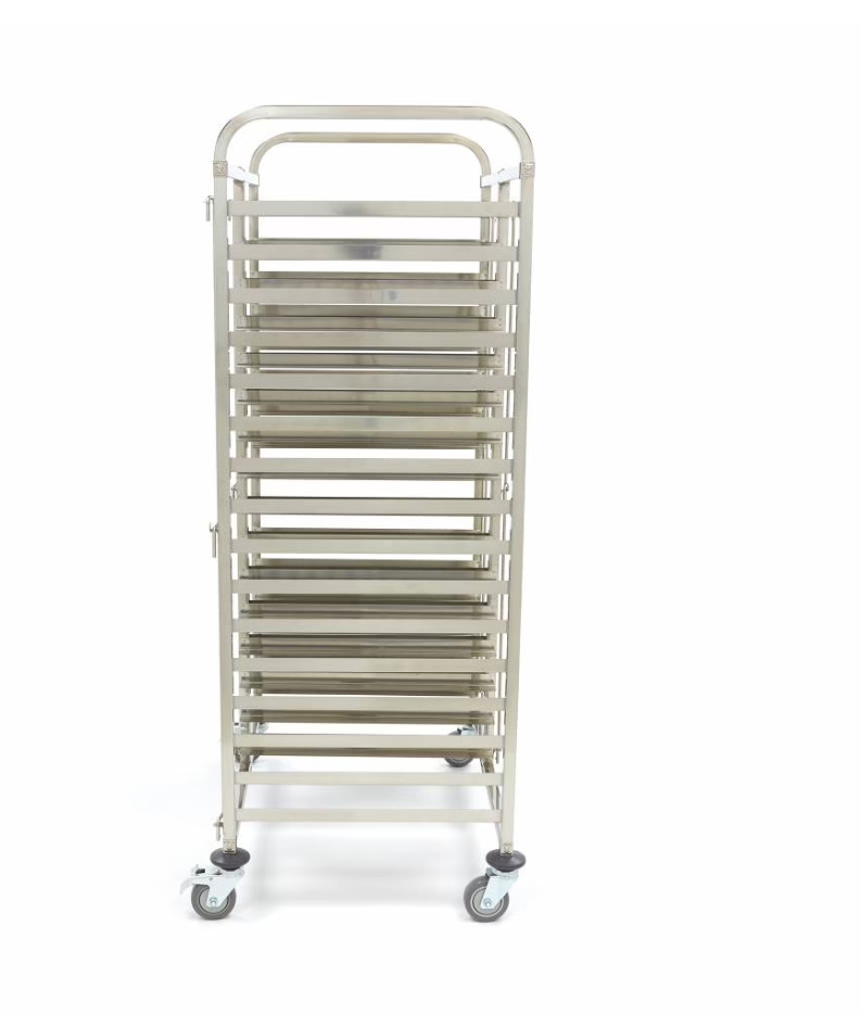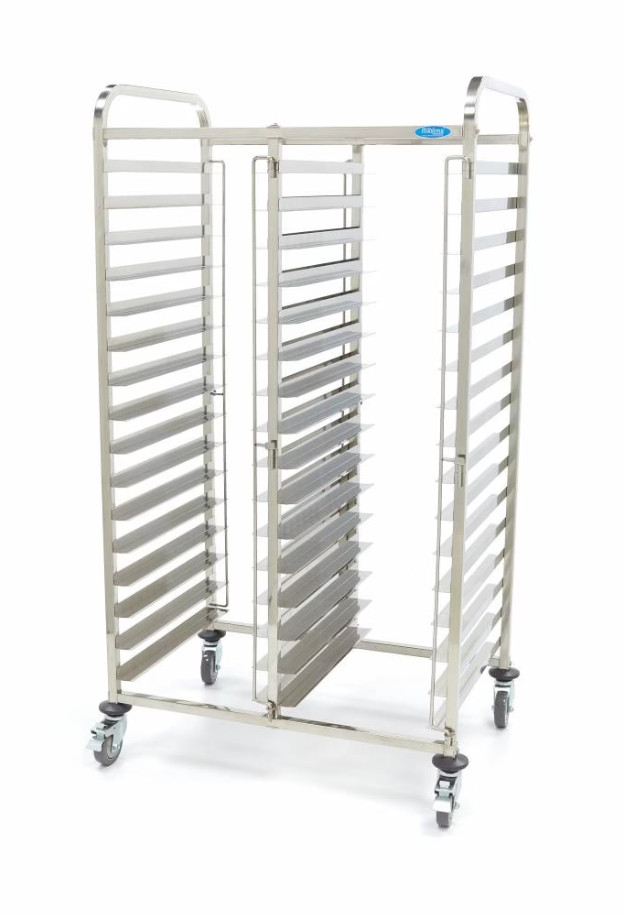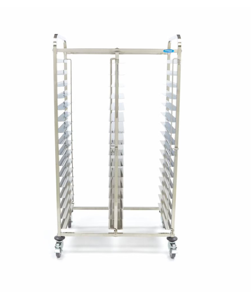 Ez a dupla soros rozsdamentes acél tálcakocsi professzionális konyhai használatra, elsősorban pékségek, éttermek és szállodák nagy kapacitású kiszolgálására készült. Az állvány 2 x 16 (összesen 32) tálca számára biztosít helyet, és a szabványos Bakerynorm (60 x 40 cm) méretű tálcákkal kompatibilis. A lapraszerelt konstrukciónak köszönhetően az eszköz gyorsan és egyszerűen összeszerelhető.