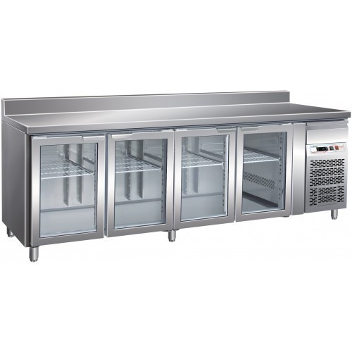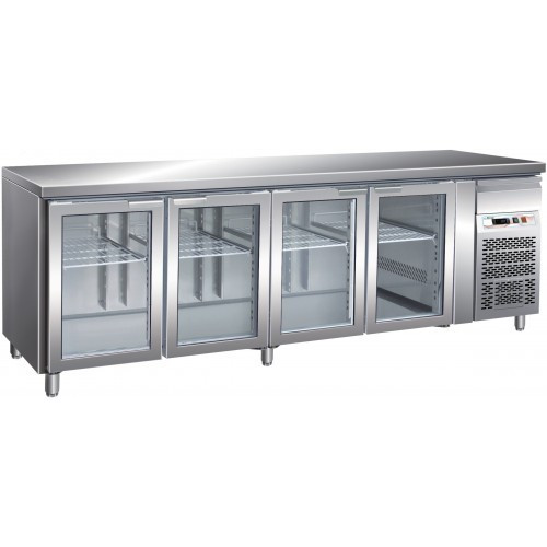 AISI 304 rozsdamentes acélból készült, ventilációs hűtéssel rendelkező négy ajtós hűtött munkaasztal.