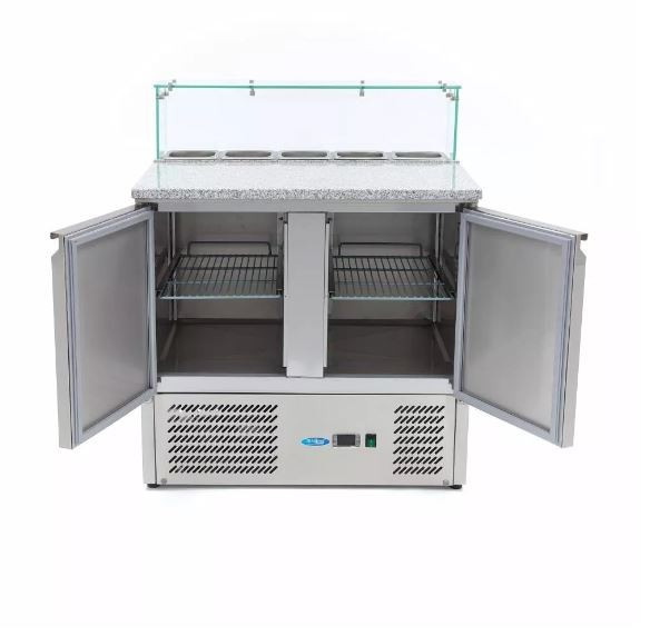 Ez a professzionális pizzakészítő hűtőszekrény 285 literes űrtartalommal rendelkezik. A két rozsdamentes acél ajtó mögött egy állítható polc található. Lehetőség van további polcok megrendelésére, és szükség esetén beillesztésére is. Még speciális tésztafiókokat is rendelhet, hogy a pizzatészta hűtve maradjon, amíg szükség van rá. Ez az előkészítő hűtőszekrény 32°C-os környezeti hőmérsékleten működik a legjobban.Könnyen tisztán tartható és higiénikus. A professzionális pizza-előkészítő hűtőszekrény erős rozsdamentes acélból és gránitból készült, így nagyon könnyen tisztítható. Ezenkívül a rozsdamentes acél előnye, hogy nagyon tartós és karcálló, ami segít minimalizálni a baktériumok terjedését. Az előkészítő hűtőszekrény egy nedves ruhával, kevés meleg vízzel és enyhe mosószerrel tisztítható. Tisztítás után töröljön mindent szárazra egy puha, száraz ruhával.