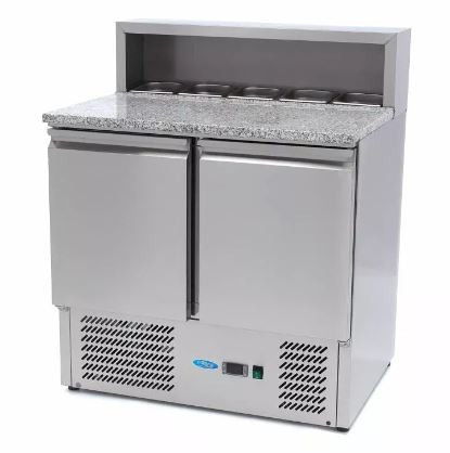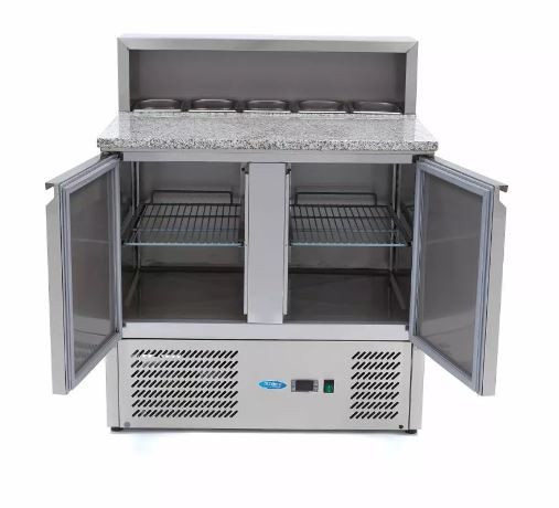 Ha pizzát készít, akkor ez a gyönyörű, hűtött előkészítő munkaasztal nélkülözhetetlen konyhájában. A pizza-előkészítő munkaasztal gránitlapjára a tészta nem ragad, így könnyen kinyújtható. A tetejére szerelt hűtött vitrinnek köszönhetően biztos lehet benne, hogy minden feltét könnyen elérhető, és tökéletesen hűtve marad. Ez a prémium konyhai készülék rozsdamentes acél tartókkal is rendelkezik a GN edények rögzítésére. Az edényeket és a fedeleket nem tartalmazza. Ezek külön rendelhetőek.