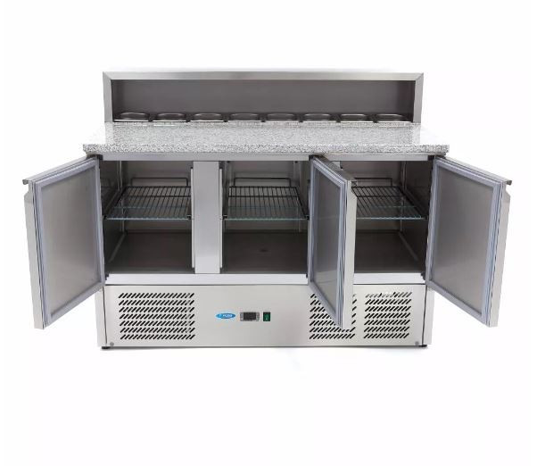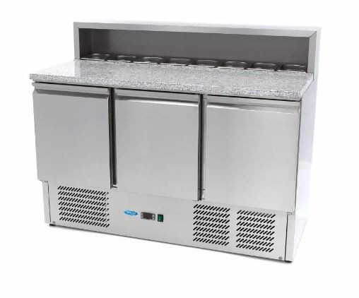 Ha pizzát készít, akkor ez a gyönyörű, hűtött előkészítő munkaasztal nélkülözhetetlen konyhájában. A pizza-előkészítő munkaasztal gránitlapjára a tészta nem ragad, így könnyen kinyújtható. A tetejére szerelt hűtött vitrinnek köszönhetően biztos lehet benne, hogy minden feltét könnyen elérhető, és tökéletesen hűtve marad. Ez a prémium konyhai készülék rozsdamentes acél tartókkal is rendelkezik a GN edények rögzítésére. Az edényeket és a fedeleket nem tartalmazza. Ezek külön rendelhetőek.