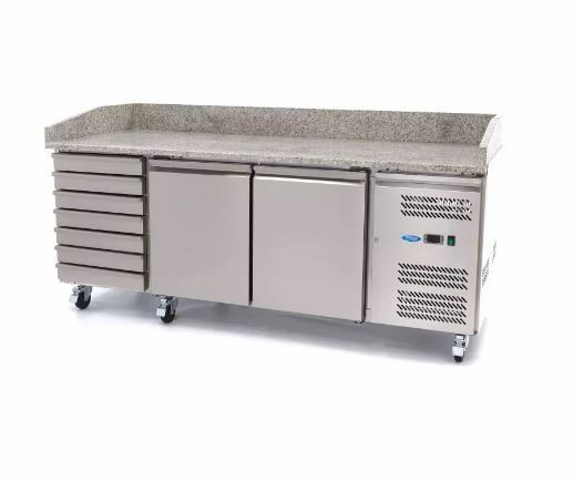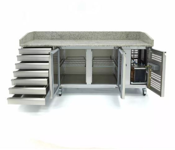 Ha pizzát készít, akkor ez a gyönyörű, hűtött előkészítő munkaasztal nélkülözhetetlen konyhájában. A pizza-előkészítő munkaasztal gránitlapjára a tészta nem ragad, így könnyen kinyújtható. A tetejére szerelt hűtött vitrinnek köszönhetően biztos lehet benne, hogy minden feltét könnyen elérhető, és tökéletesen hűtve marad. Ez a prémium konyhai készülék rozsdamentes acél tartókkal is rendelkezik a GN edények rögzítésére. Az edényeket és a fedeleket nem tartalmazza. Ezek külön rendelhetőek.